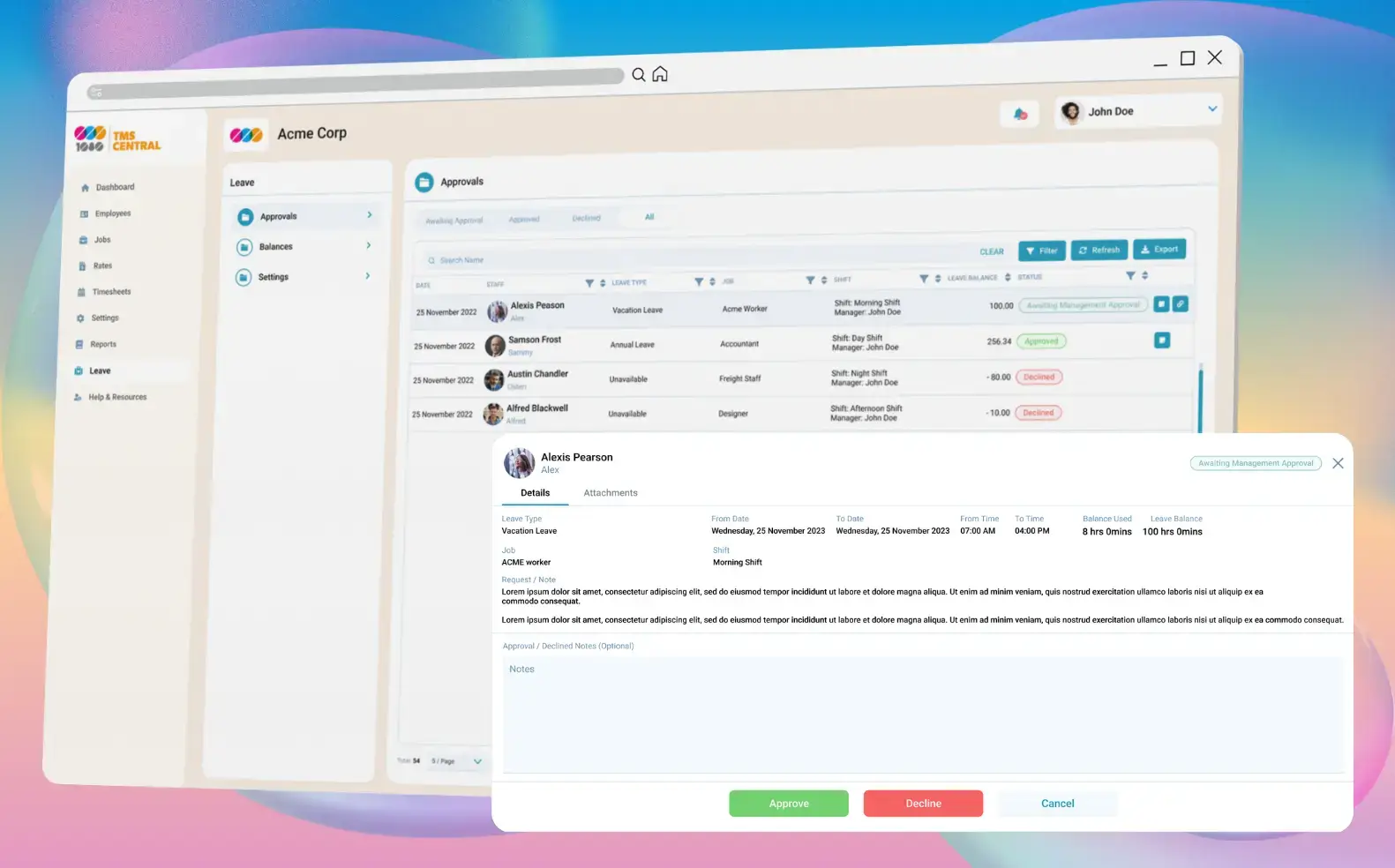 Our robust time and attendance solution revolutionizes employee hour management with features that streamline every aspect of the process. From unlimited timesheet submissions and multi-level approvals to automated leave accrual and non-compliance flagging, the system ensures accuracy and accountability. The platform provides comprehensive visibility through audit logging, gross pay summaries, and KPI analytics, while supporting document attachments for seamless record-keeping. This integrated approach simplifies administration while providing the insights needed to drive operational efficiency and employee satisfaction.